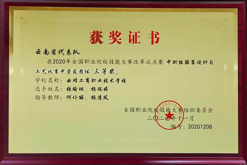 2020年全国技能大赛奖状-学校荣誉-曲靖工商学校