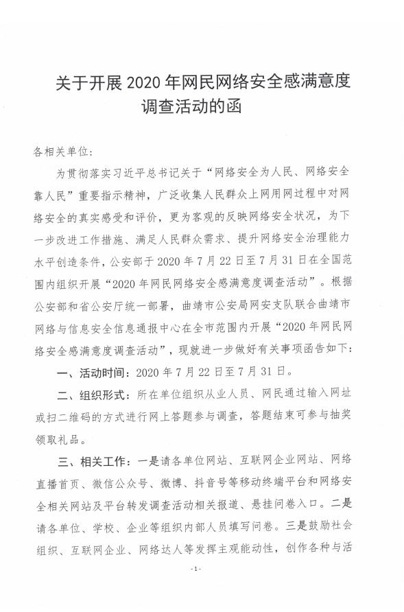 【基础数据】关于开展2020年网民网络安全感满意度调查活动的函