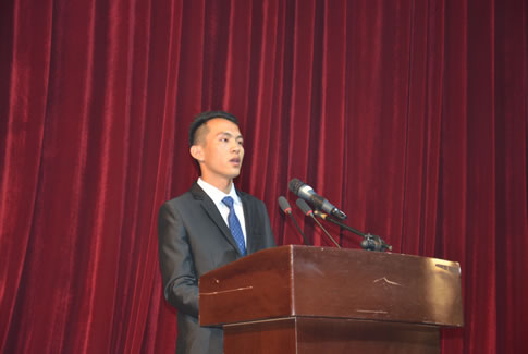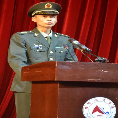曲靖师院党委副书记王志刚致欢迎辞。市委常委、曲靖军分区政委、曲靖市征兵领导小组副组长袁顺钦大校作动员讲话,他提出三点希望,他希望大学生要做有信仰、有追求的热血青年,在认识中国梦中彰显人生价值;希望大学生们要做有担当,有责任的青年才俊,在实现强军梦想中创造人生辉煌;希望大学生要做有本事、有作为的青年楷模,在践行成才梦中实现人生跨越。曲靖军分区参谋长黄涛大校作动员宣传演讲,他满怀深情的讲述了不同历史时期中国军事力量的变化和军事、航天技术的蓬勃发展历程,鼓励大学生应该担负起历史重任,积极参投身到军营生活和军队建设中来,释放青春活力,贡献自己的力量。